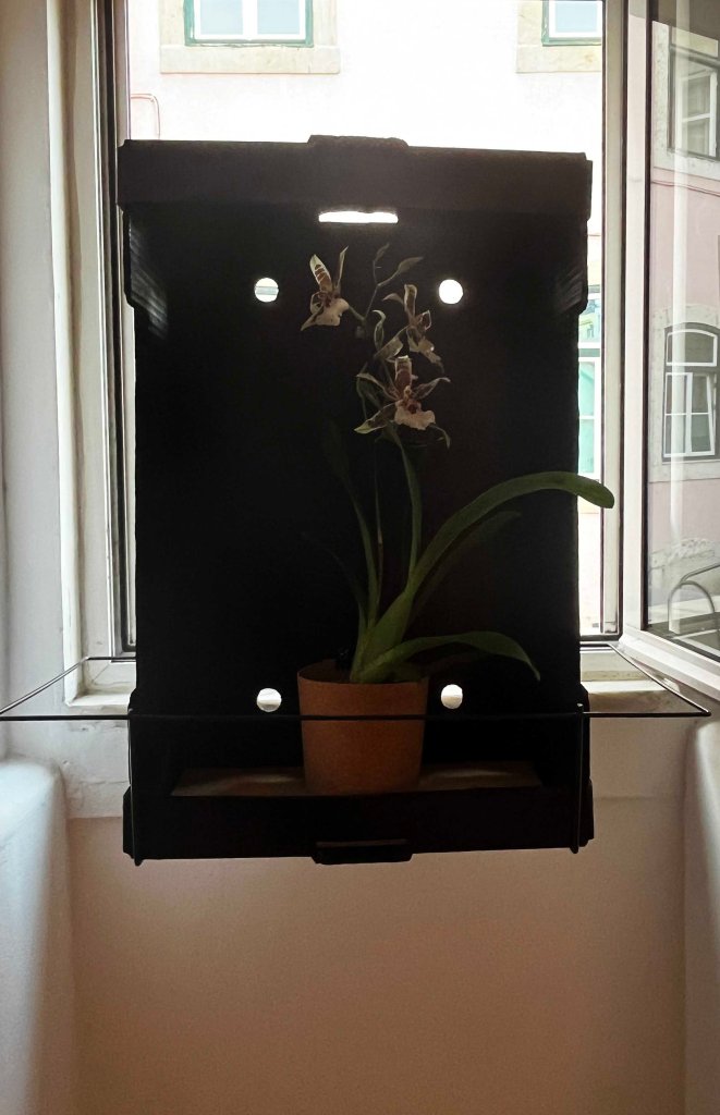 Mixed Media installation : Recycled Cardboard Box, iron, acrylic, orchid plant , cork